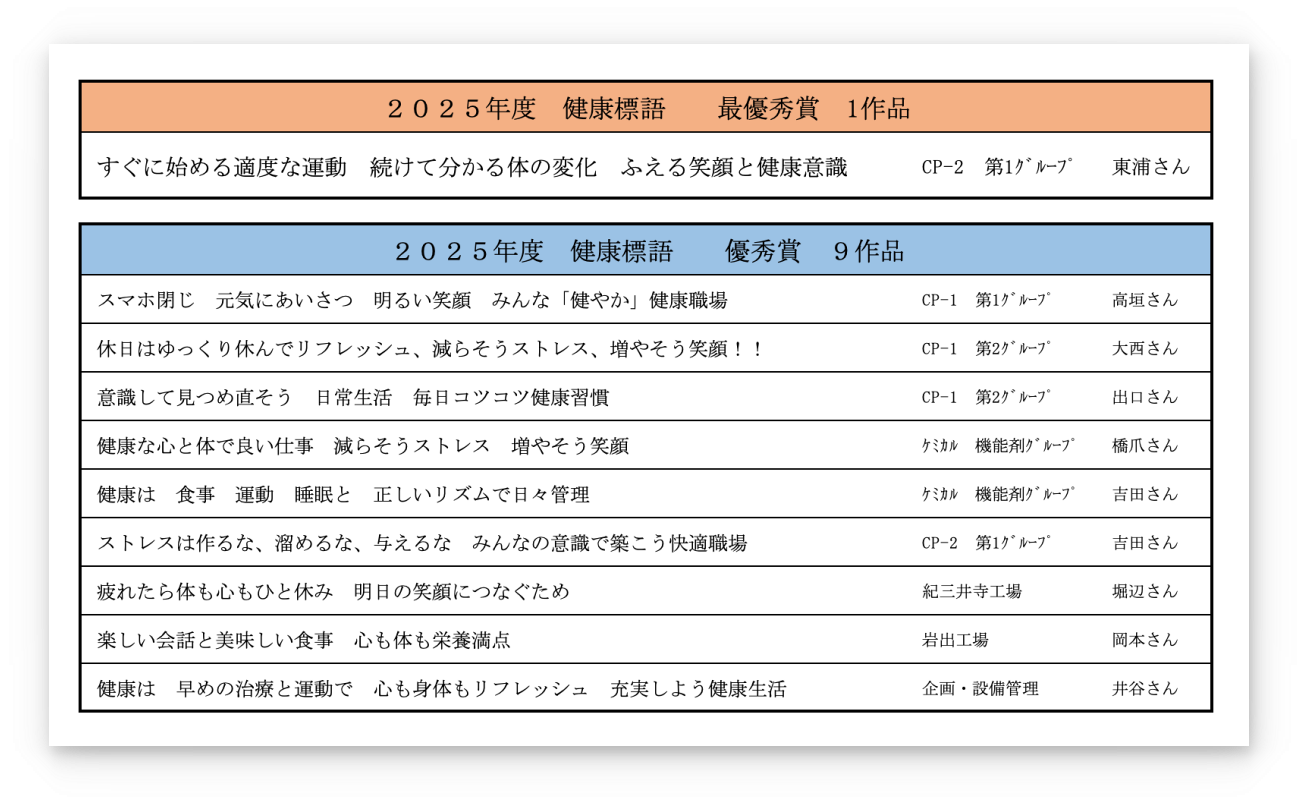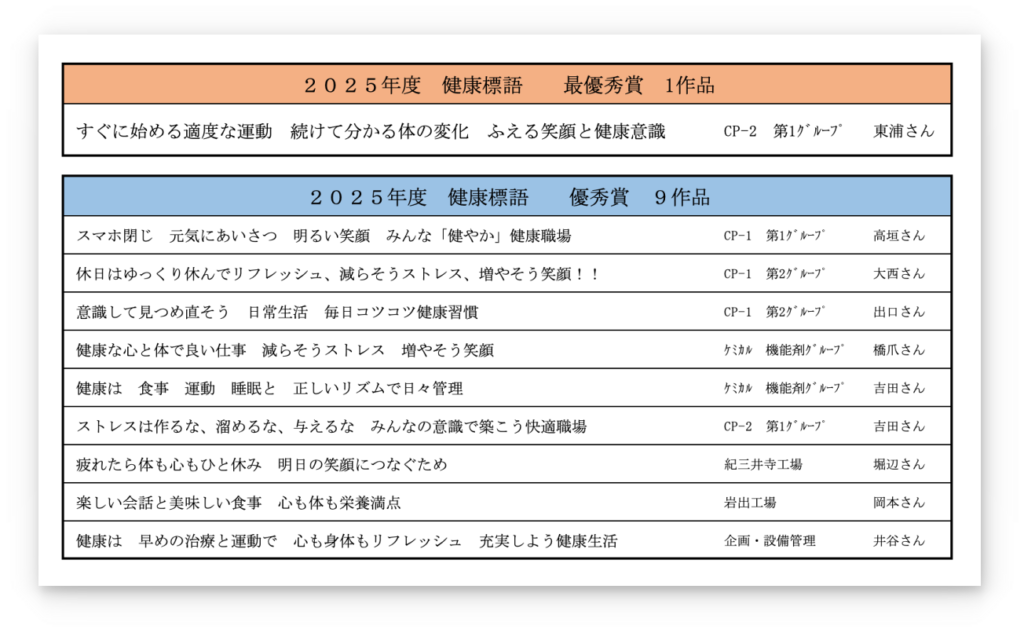 山本産業では、この期間に合わせて『健康にまつわる標語』を募集し、各自が健康に対する関心を高める機会として取り組んでいます。